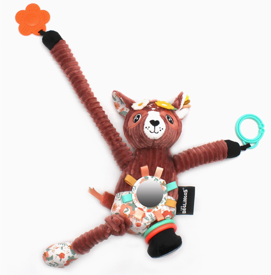 Deze activiteiten Knuffel Melimelos het Hert is activiteitenspeelgoed voor baby’s, met interactieve functies zoals een uitschuifbaar pootje, bijtring, spiegel, knisperpapier en meer. Makkelijk om overal mee naartoe te nemen en eenvoudig te bevestigen aan boxen, kinderwagens en speelbogen.