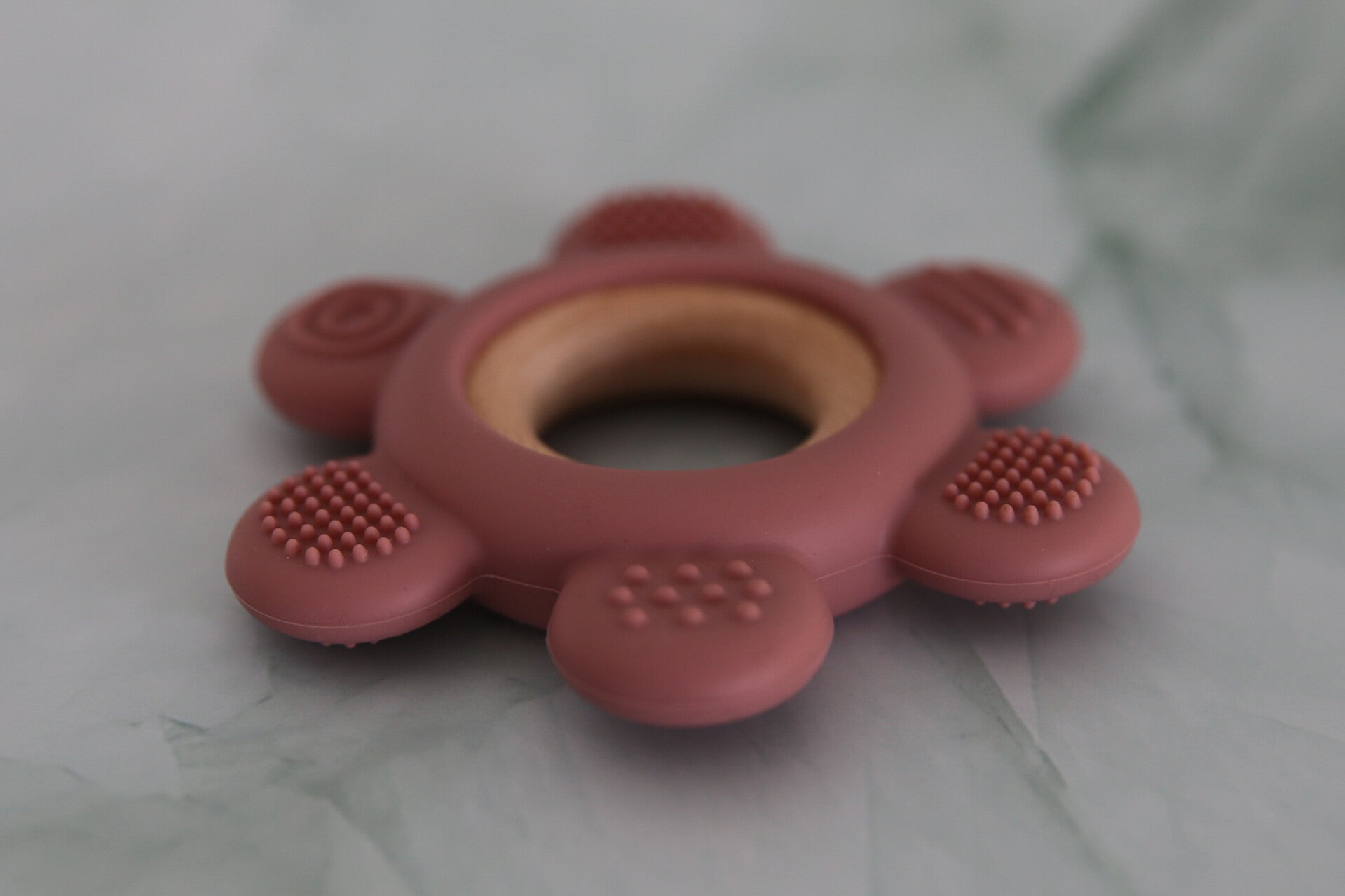 Een prachtige bijtring die je kindje goed vast kan houden en in het mondje kan stoppen door de uitstekende vormpjes.